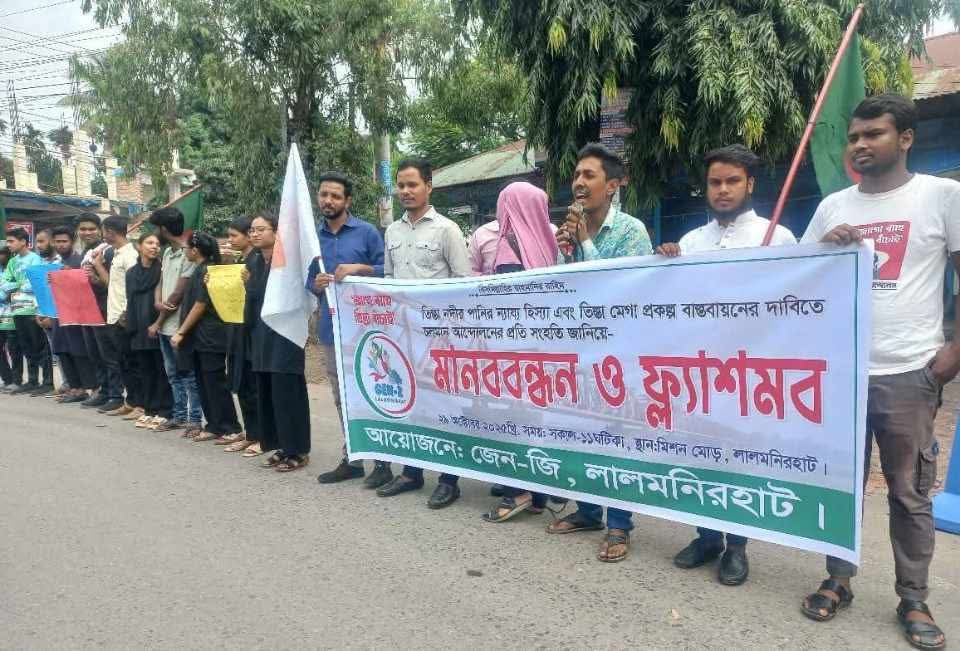 তিস্তা নদী রক্ষা আন্দোলনের প্রতি সংহতি জানিয়ে তরুণদের সংগঠন জেন-জি লালমনিরহাটে আজ বুধবার (২৯ অক্টোবর) সকাল ১১টায় লালমনিরহাটের মিশন মোড়ে আয়োজন করে এক ব্যতিক্রমী মানববন্ধন ও ফ্ল্যাশমব কর্মসূচি।