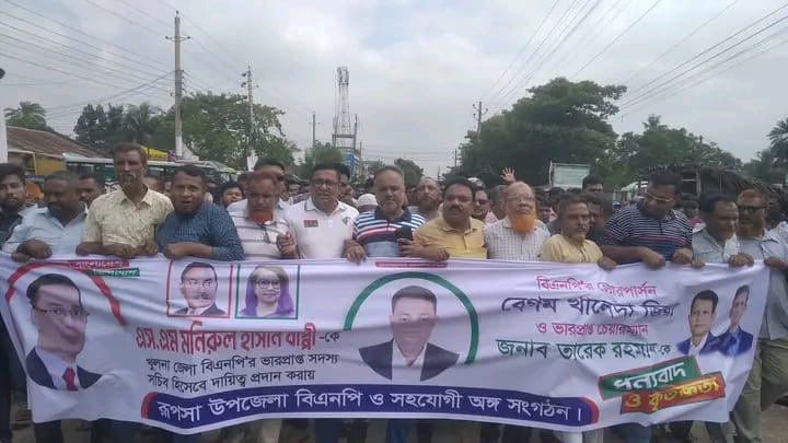 খুলনা জেলা বিএনপির আহবায়ক কমিটিতে জেলা বিএনপির সাবেক সদস্য সচিব মনিরুল হাসান বাপ্পিকে ভারপ্রাপ্ত সদস্য সচিব হিসাবে দায়িত্ব অর্পন করায় দলটির ভারপ্রাপ্ত চেয়ারম্যান তারেক রহমান কে শুভেচ্ছা ও অভিনন্দন জানিয়ে আনন্দ মিছিল ও পথসভা ২ নভেম্বর রবিবার সকালে পূর্ব রূপসা ঘাট এলাকায় অনুষ্ঠিত হয়। মিছিলটি নৈহাটি ইউনিয়ন বিএনপির কার্যালয়ের সামনে থেকে শুরু হয়ে বিভিন্ন স্থান প্রদক্ষিণ করে পূর্ব রূপসা ঘাটে পথসভার মাধ্যমে শেষ হয়। উল্লেখ্য গত ১ নভেম্বর রাতে বিএনপির সিনিয়র যুগ্ম মহাসচিব রুহুল কবীর রিজভি স্বাক্ষরিত প্রেস বিজ্ঞপ্তির মাধ্যমে তাকে ভারপ্রাপ্ত সদস্য সচিব হিসাবে দায়িত্ব প্রদান করা হয়। পথসভায় সভাপতিত্ব করেন রূপসা উপজেলা বিএনপির আহবায়ক মোল্যা সাইফুর রহমান। রূপসা উপজেলা বিএনপির সদস্য সচিব জাবেদ হোসেন মল্লিকের সঞ্চালনায় বক্তৃতা করেন রূপসা উপজেলা বিএনপির সিনিয়র যুগ্ম আহবায়ক বিকাশ মিত্র,যুগ্ম আহবয়াক আবুল কালাম গোলদার, রয়েল আজম, রবিউল ইসলাম রবি, মহসিন জমাদ্দার, হুমায়ুন কবীর, ঘাটভোগ ইউনিয়ন বিএনপির সাবেক আহবায়ক এসএম আঃ মালেক,টিএসবি ইউনিয়ন বিএনপির সাবেক আহবায়ক খান আনোয়ার হোসেন, নৈহাটী ইউনিয়ন বিএনপির সাবেক সদস্য সচিব দিদারুল ইসলাম, বিএনপি নেতা মিকাইল বিশ্বাস, খন্দকার শরিফুল ইসলাম, সরদার শিহাবুল ইসলাম,জেলা যুবদলের যুগ্ম আহবায়ক মমিনুর রহমান সাগর, ইয়ারুল ইসলাম রিপন, রূপসা উপজেলা যুবদলের সদস্য সচিব রুবেল মীর, স্বেচ্ছাসেবক দল নেতা আসাদুজ্জামান বিপ্লব, শ্রমিকদল নেতা ইউনুছ গাজী, বিএনপি নেতা আরিফ মোল্যা সাইফুল ইসলাম পাইক, সেলিম রেজা, কামরুজ্জামান জুয়েল, মাসুম রেজা, ইসমাইল শেখ, আজিবুল্লাহ শেখ, খন্দকার ইমরান হোসেন, খায়রুল আলম খোকন, মিকাইল হোসেন, জাহাঙ্গীর হালদার,মুশফিকুর রহমান সুমন,শওকত আলী, মামুন হালদার, মাসুদ হালদার, মোয়াজ্জেম বাবু, বাদশা আলমগীর, রনি লস্কর, মহব্বত, আলামিন, জান্নাতুন নাঈম, প্রমূখ।