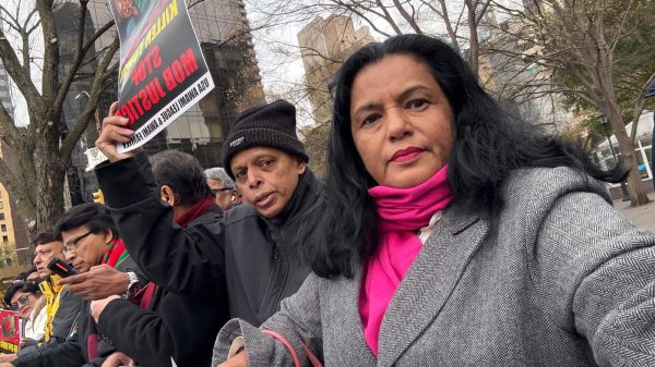 যুক্তরাষ্ট্র আওয়ামী লীগের অন্যতম উপদেষ্টা বীর মুক্তিযোদ্ধা ও সমাবেশের সভাপতি ড. প্রদীপ রঞ্জন কর বলেন, একাত্তরের পরাজয়ের প্রতিশোধ নিতে রাজাকার-আলবদর ও জামাত-শিবির গভীর ষড়যন্ত্রে লিপ্ত হয়েছে। মুহম্মদ ইউনূসের ইঙ্গিতে একাত্তরের ঘাতকেরা মুক্তিযুদ্ধের চেতনায় উজ্জীবিত বাঙালিদেরকে প্রকাশ্যে হত্যা করছে। বাংলাদেশকে অর্থনৈতিক সমৃদ্ধি প্রদানের সিঁড়িতে উঠানো প্রধানমন্ত্রী শেখ হাসিনাকে ক্ষমতা থেকে সরানোর পর সাজানো মামলায় তাকে ফাঁসিতে ঝুলানোর পরিক্রমা চলছে। ধর্মীয় জঙ্গিদের কবলে পড়া বাংলাদেশ ডুকরে কাঁদছে। বিশ্ব মানবতার দৃষ্টি কামনা করেছেন এই কর্মসূচিতে অংশগ্রহণকারিরা। এ সময় আরো অভিযোগ করা হয় যে, ভ’য়া হত্যা মামলা দায়ের করা হয়েছে ২৬৬ জন সাংবাদিকের বিরুদ্ধে। জাতীয় প্রেসক্লাবের সেক্রেটারি শ্যামল দত্তসহ প্রথিতযশা ১৪ সাংবাদিককে আটক রাখা হয়েছে বিশ্বাসযোগ্য তদন্ত ছাড়াই। ক্ষমতাসীন গোষ্ঠির অন্যায়-অপকর্মের সমালোচনা বন্ধে রাজনৈতিক কর্মী ও গণমাধ্যম কর্মীদের হুমকি দেয়া হচ্ছে। মানববন্ধন থেকে অবিলম্বে গ্রেফতারকৃত সকল সাংবাদিক ও রাজনীতিকদের মুক্তি এবং দায়েরকৃত সকল মামলা প্রত্যাহারের দাবি জানানো হয় ।সমাবেশ শেষে জাতিসংঘের মহাসচিব বরাবরে স্মারকলিপি প্রদান করা হয় ।