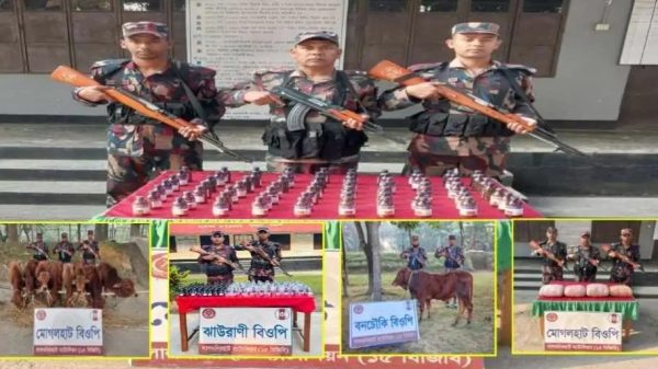 ভারতীয় গরু ও মাদকদ্রব্য বাংলাদেশে পাচারের চেষ্টা করছে। উক্ত তথ্যের ভিত্তিতে ২৩ নভেম্বর ২০২৫ রাত আনুমানিক ১২:৩০ মিনিটে মোগলহাট বিওপি-সংশ্লিষ্ট কুমারটারী এলাকায় (থানা-আদিতামারী, জেলা-লালমনিরহাট) টহল পরিচালনার সময় ভারতীয় সীমান্ত দিক থেকে গরুসহ কয়েকজন চোরাকারবারী বাংলাদেশে প্রবেশের চেষ্টা করলে বিজিবি টহলদল তাদের চ্যালেঞ্জ করে। এসময় চোরাকারবারীরা গরু ফেলে পালিয়ে যায়। ঘটনাস্থল থেকে ০৮টি ভারতীয় গরু জব্দ করা হয়।