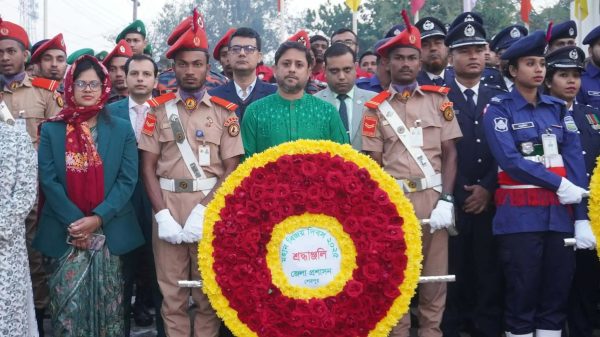 শেরপর আজ মহান বিজয় দিবস ২০২৫ যথাযথ মর্যাদা ও ভাবগাম্ভীর্যের সঙ্গে উদযাপনের অংশ হিসেবে ভোর ৬:৩৮ মিনিটে ৩১ বার তোপধ্বনির মাধ্যমে দিবসটির সূচনা করা হয়।
