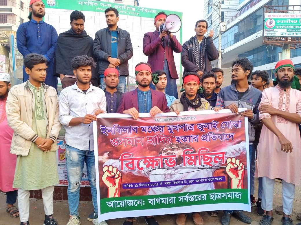 শুক্রবার (১৯ ডিসেম্বর ২০২৫) বিকাল ৪ ঘটিকায় বাগমারা উপজেলার ভবানীগঞ্জ জিরো পয়েন্ট প্রাঙ্গণ থেকে বিক্ষোভ মিছিলটি শুরু হয়। মিছিলটি ভবানীগঞ্জ জিরো পয়েন্ট থেকে গোডাউন মোড় সড়ক প্রদক্ষিণ করে ভবানীগঞ্জ জিরো পয়েন্টে গিয়ে শেষ হয়।