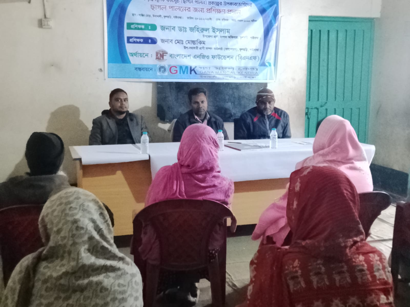 বাংলাদেশ এনজিও ফাউন্ডেশন (বিএনএফ) এর অর্থায়নে ও গণ মঙ্গল কেন্দ্র (জিএমকে) এর বাস্তবায়নে,আয়বৃদ্ধিমূলক কর্মসূচি আওতায় ছাগল পালন বিষয়ে উপকারভোগীদের জন্য একদিনব্যাপী প্রশিক্ষণ অনুষ্ঠিত হয়েছে। রোববার (২৮ ডিসেম্বর ২০২৫) গণ মঙ্গল কেন্দ্র (জিএমকে) এর আয়োজনে সংস্থার নিজস্ব হলরুমে এ প্রশিক্ষণ কর্মসূচি অনুষ্ঠিত হয়।
