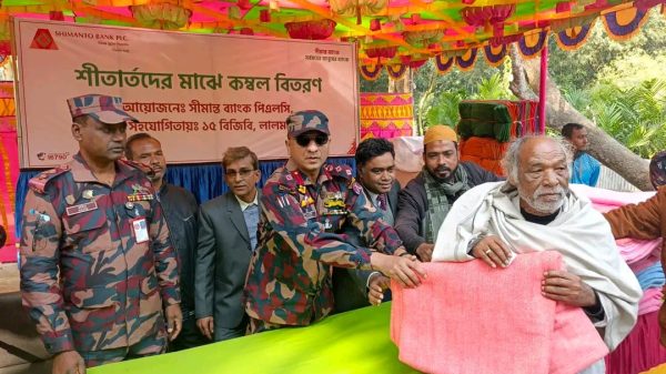 বর্ডার গার্ড বাংলাদেশ (বিজিবি)-এর উদ্যোগে লালমনিরহাটে শীতার্ত ও অসহায় মানুষের মাঝে শীতবস্ত্র বিতরণ করা হয়েছে।