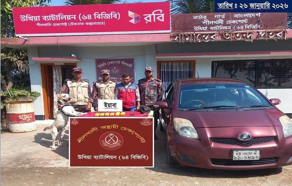 সোমবার (২৬ জানুয়ারি ২০২৬) দুপুর সাড়ে ১১টার দিকে টেকনাফ থেকে কক্সবাজারগামী একটি যাত্রীবাহী প্রাইভেটকার শীলখালী চেকপোস্টে পৌঁছালে বিজিবির নিয়মিত তল্লাশি কার্যক্রম পরিচালনা করা হয়। এ সময় কর্তব্যরত বিজিবি সদস্যদের সঙ্গে নারকোটিক্স ডগ ‘হেনরি’ তল্লাশিতে অংশ নেয়।