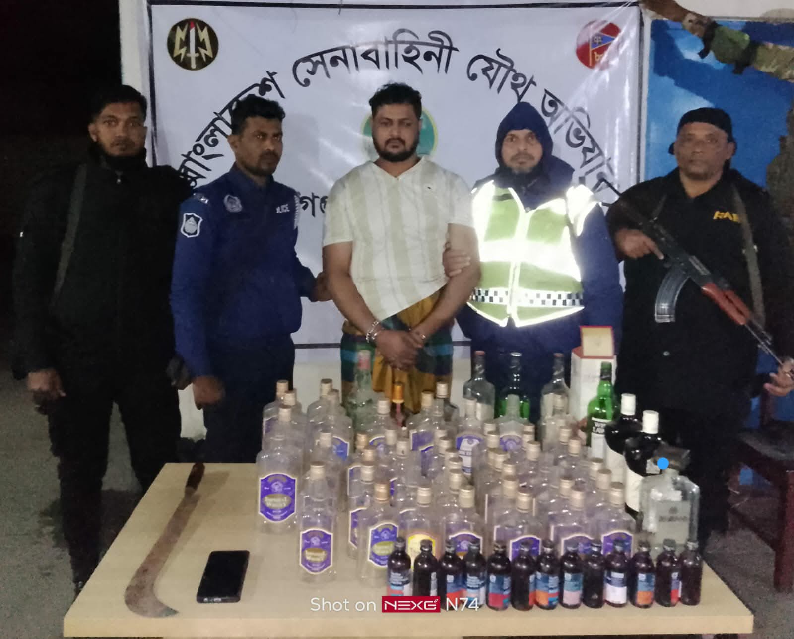 আটক ব্যক্তির কাছ থেকে একটি রামদা, ৬৫টি বড় মদের বোতল, ১৩টি ফেন্সিডিলের বোতল এবং একটি স্মার্টফোন জব্দ করা হয়।
