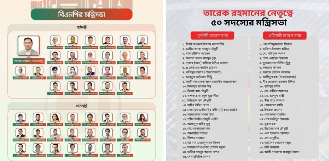 ত্রয়োদশ জাতীয় সংসদ নির্বাচনে নিরঙ্কুশ জয় পাওয়া বিএনপির নির্বাচিত প্রতিনিধিরা আজ (মঙ্গলবার, ১৭ ফেব্রুয়ারি) সকালে সংসদ সদস্য হিসেবে শপথ নিয়েছেন। এরপর বিকেল ৪টায় জাতীয় সংসদ ভবনের দক্ষিণ প্লাজায় নতুন মন্ত্রিসভার সদস্যদের শপথ অনুষ্ঠিত হবে। মন্ত্রিসভায় ২৫ জন পূর্ণমন্ত্রী হিসেবে শপথ নেন। শপথের আগে নতুন মন্ত্রিসভার সদস্যদের মধ্যে দপ্তর বণ্টন চূড়ান্ত হয়েছে।