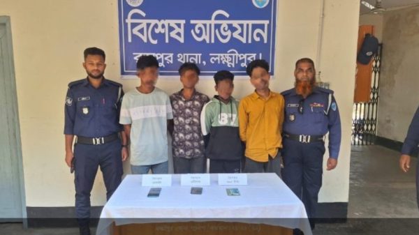 লক্ষ্মীপুরের রায়পুরে এক তরুণকে সরিষা ক্ষেতে নিয়ে মারধর ও মৃত্যুর হুমকি দিয়ে মোবাইল ফোন ও নগদ টাকা ছিনতাইয়ের অভিযোগে চারজনকে গ্রেফতার করেছে পুলিশ।