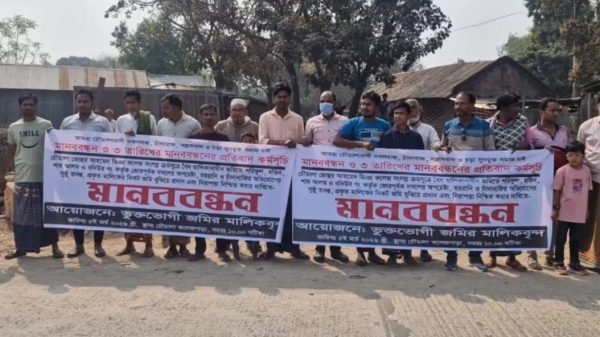 জোরপূর্বক জমি দখল ও চাঁদাবাজির ঘটনায় সুষ্ঠ তদন্ত, বিচার ও নিরাপত্তার দাবি জানান ভুক্তভোগী জমির মালিকরা। মানববন্ধনে বক্তব্য রাখেন, মো. জুয়েল আলী, বাইরুল ইসলাম, তাজেমুল হক৷ সাম মোহাম্মদ, আনারুল হক, আব্দুল মজিদসহ অন্যান্যরা।