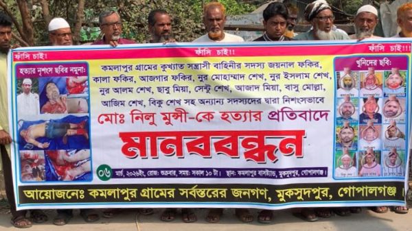 গোপালগঞ্জের মুকসুদপুরে নিলু মুন্সির হত্যাকারীদের দ্রুত গ্রেফতার ও ফাঁসির দাবিতে মানববন্ধন করেছে তার পরিবার ও এলাকাবাসী।