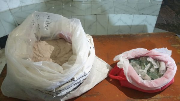 তল্লাশি চালিয়ে ওই ব্যাগের ভেতর থেকে১২ কেজি ৫৮০ গ্রাম বিস্ফোরক সদৃশ গান পাউডার এবং ০২ কেজি ১৪০ গ্রাম ভাঙা কাঁচের গুঁড়া উদ্ধার করা হয়।