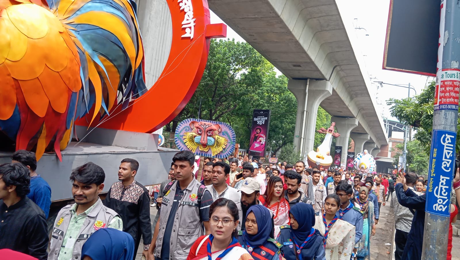 ঢাকা বিশ্ববিদ্যালয়ের চারুকলা অনুষদ থেকে বের করা হয় ইউনেস্কো স্বীকৃত ঐতিহ্যবাহী ‘মঙ্গল শোভাযাত্রা’। এবারের শোভাযাত্রার মূল প্রতিপাদ্য ছিল নববর্ষের ঐকতান গনতন্ত্রের পুনরুত্থান । বিশালকায় রঙিন মোরগ, পাখি শান্তির কবুতর ও হাতি, লোকজ পুতুলের প্রতিকৃতি নিয়ে মিছিলে অংশ নেন সব বয়সী মানুষ। লাল-সাদা পোশাক আর রঙিন মুখোশে রাজপথ যেন হয়ে ওঠে এক চলন্ত শিল্পকলা।
