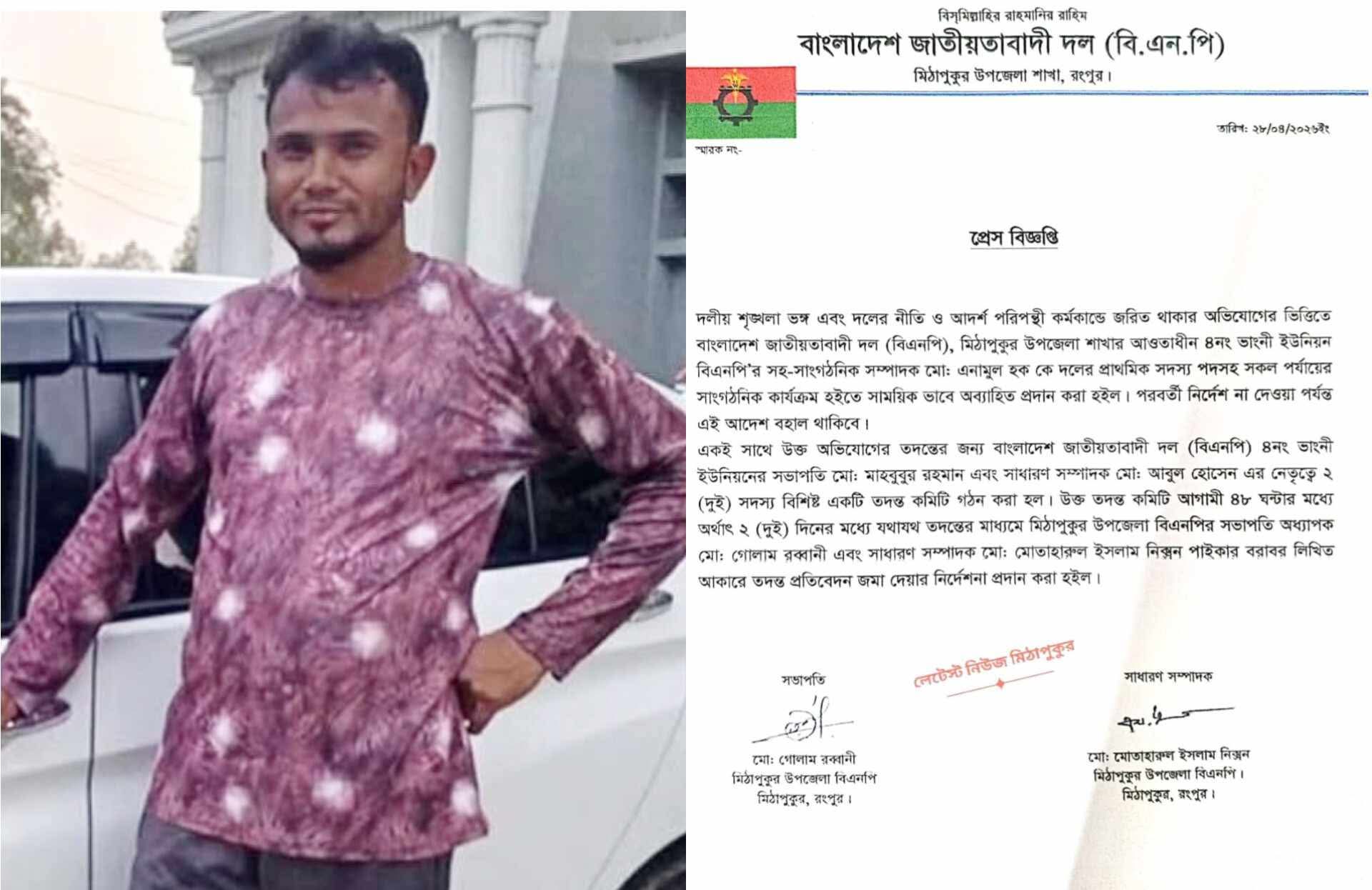 মাটি মামুন, রংপুর :ফ্যামিলি কার্ড দেওয়ার প্রলোভন দেখিয়ে এক নারীকে ধর্ষণচেষ্টার অভিযোগে রংপুরের মিঠাপুকুরে এক বিএনপি নেতাকে দল থেকে সাময়িক বহিষ্কার করা হয়েছে। অভিযুক্তের নাম মো: এনামুল হক, তিনি উপজেলার ৪নং ভাংনী ইউনিয়ন বিএনপির সহ-সংগঠনিক সম্পাদক ছিলেন। ২৮ এপ্রিল ২০২৬ তারিখে প্রকাশিত সংবাদ অনুযায়ী, এনামুল হকের বিরুদ্ধে ফ্যামিলি কার্ড পাইয়ে দেওয়ার কথা বলে এক নারীকে লাঞ্ছিত ও ধর্ষণচেষ্টার অভিযোগ ওঠে। বিষয়টি জানাজানি হলে এলাকায় ব্যাপক চাঞ্চল্যের সৃষ্টি হয়। ঘটনাটি জানাজানি হওয়ার পর দলীয় শৃঙ্খলা ও আদর্শ পরিপন্থী কর্মকাণ্ডে জড়িত থাকার অভিযোগে মিঠাপুকুর উপজেলা বিএনপি এনামুল হককে দলের প্রাথমিক সদস্য পদসহ সকল পর্যায়ের সাংগঠনিক কার্যক্রম থেকে সাময়িক অব্যাহতি প্রদান করেছে। একইসাথে বিষয়টির অধিকতর তদন্তের জন্য ২ সদস্যবিশিষ্ট একটি তদন্ত কমিটি গঠন করা হয়েছে, যাদের আগামী ৪৮ ঘণ্টার মধ্যে প্রতিবেদন জমা দেওয়ার নির্দেশ দেওয়া হয়েছে।