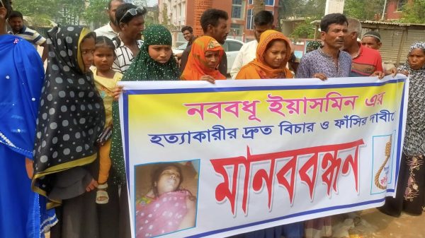 সাইফুল ইসলাম, নওগাঁ জেলা প্রতিনিধি : নওগাঁয় গৃহবধূ ইয়াসমিন বানু হত্যায় জড়িতদের বিচার দাবিতে মানববন্ধন করেছে কর্মসূচি পালন করেছে তার স্বজন ও এলাকাবাসীরা। রবিবার দুপুরে নওগাঁ শহরের মুক্তির মোড়